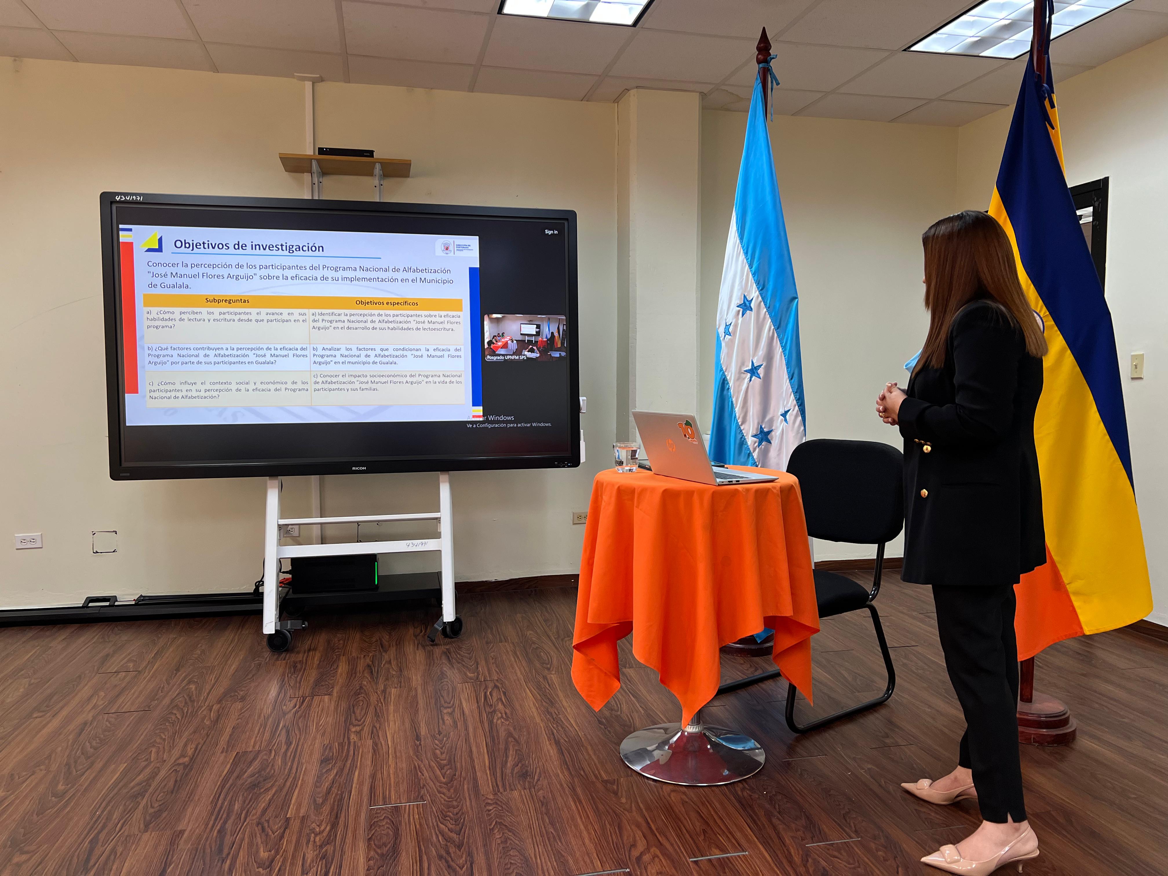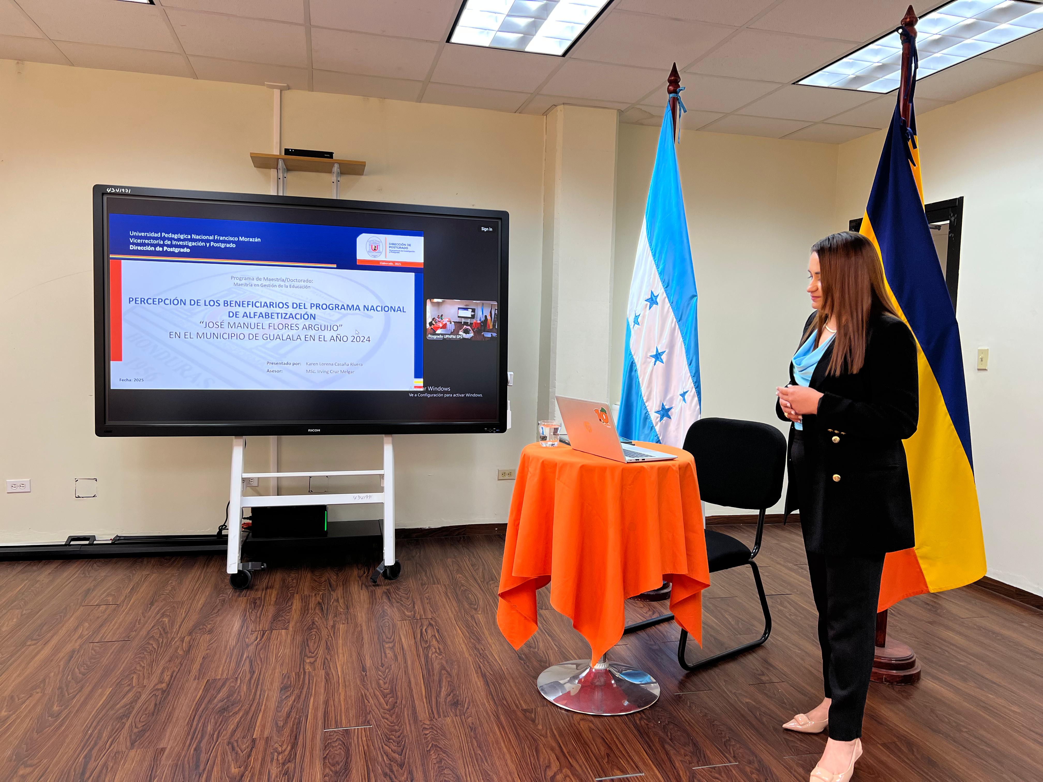La Licenciada Karen Lorena Casaña Rivera, estudiante de la Maestría en Gestión de la Educación, realizó exitosamente la defensa de su tesis titulada "Percepción de los beneficiarios del Programa Nacional de Alfabetización “José Manuel Flores Arguijo” en el Municipio de Gualala en el año 2024." La presentación tuvo lugar el día jueves 25 de septiembre de 2025, en las instalaciones de Posgrado del Centro Universitario Regional de San Pedro Sula.