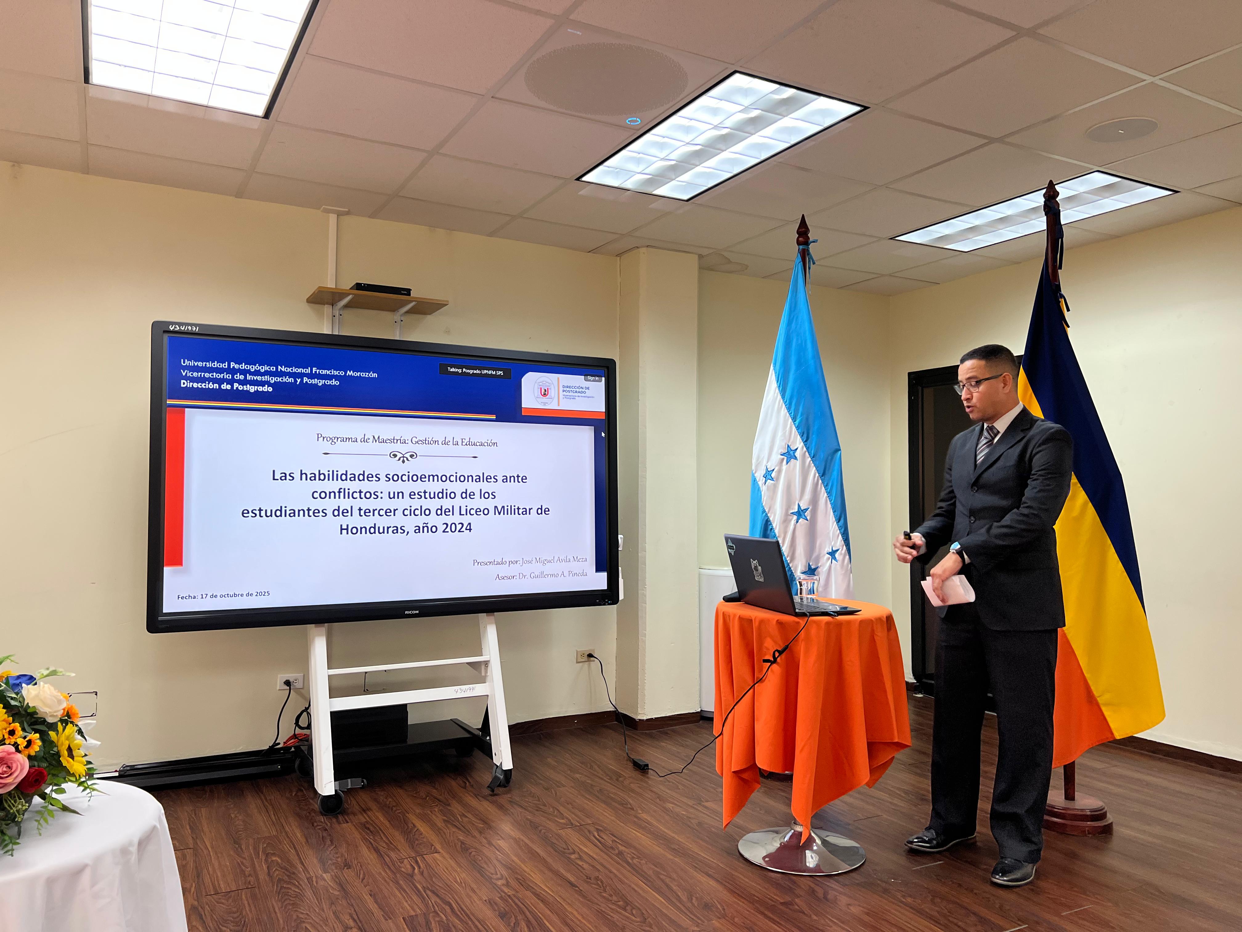 El Licenciado José Miguel Avila Meza, estudiante de la Maestría en Gestión de la Educación, realizó exitosamente la defensa de su tesis titulada "Las habilidades socioemocionales ante conflictos: un estudio de los estudiantes del tercer ciclo del Liceo Militar de Honduras, año 2024." La presentación tuvo lugar el día viernes 17 de octubre de 2025, en las instalaciones de Posgrado del Centro Universitario Regional de San Pedro Sula.