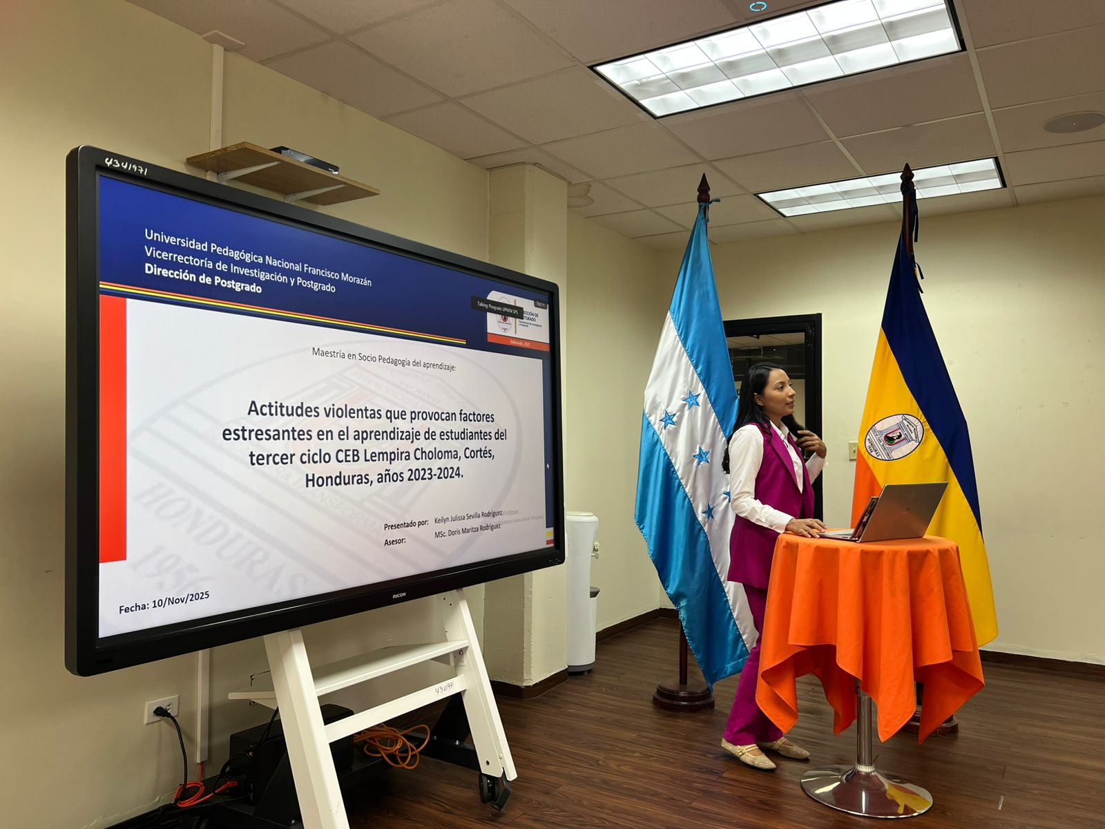 La Licenciada Keilyn Julissa Sevilla Rodríguez, estudiante de la Maestría en Socio Pedagogía del Aprendizaje, realizó exitosamente la defensa de su tesis titulada “Actitudes violentas que provocan factores estresantes en el aprendizaje de estudiantes del tercer ciclo CEB Lempira Choloma, Cortés, Honduras, años 2023-2024”; La presentación tuvo lugar el día lunes 10 de noviembre de 2025, en las instalaciones de Posgrado del Centro Universitario Regional de San Pedro Sula.