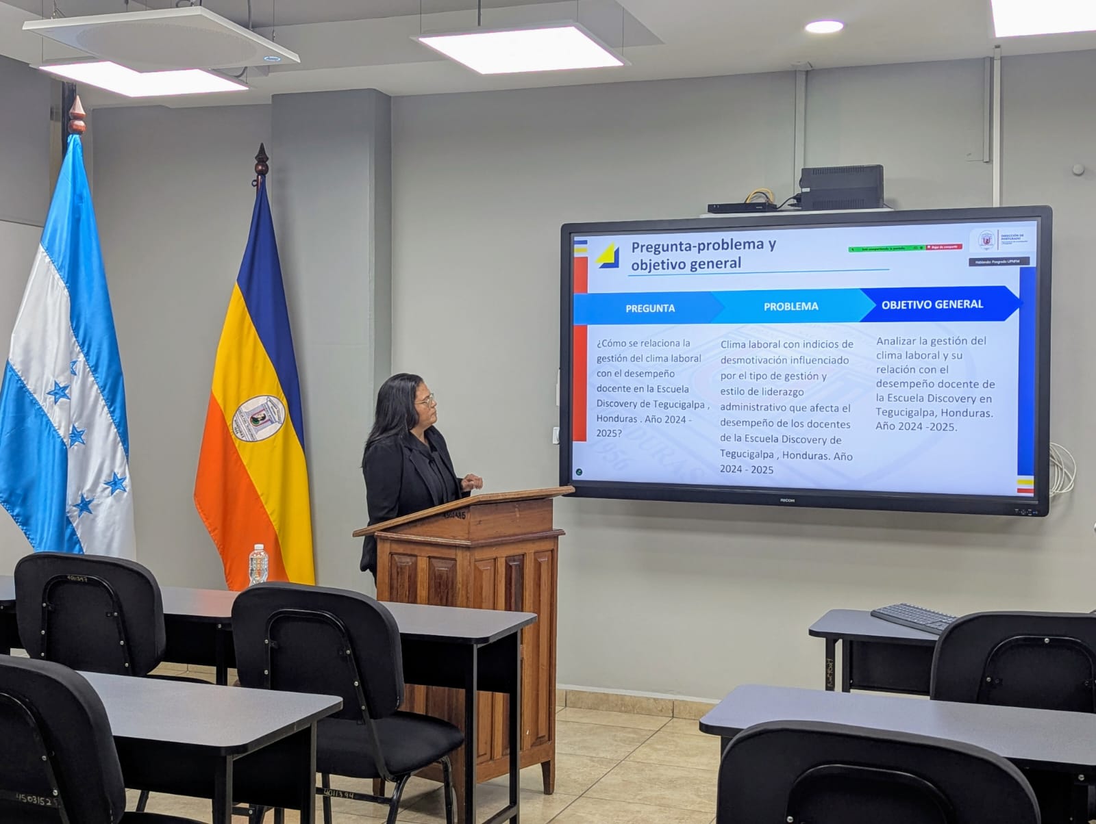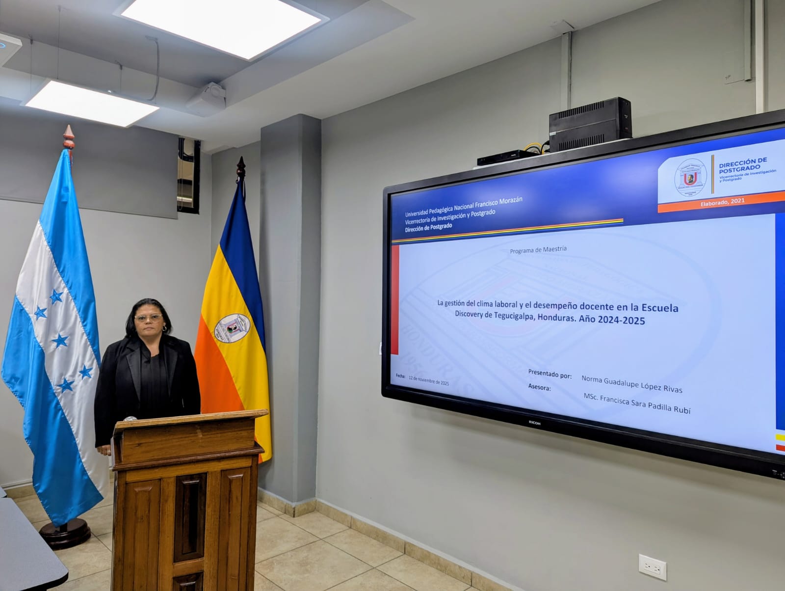 La Licenciada Norma Guadalupe López Rivas, estudiante de la Maestría en Gestión de la Educación, realizó exitosamente la defensa de su tesis titulada “La gestión del clima laboral y el desempeño docente en la Escuela Discovery de Tegucigalpa, Honduras. Año 2024-2025”; La presentación tuvo lugar el día miércoles 12 de noviembre de 2025, en las instalaciones de Posgrado del Centro Universitario Regional de Tegucigalpa.
