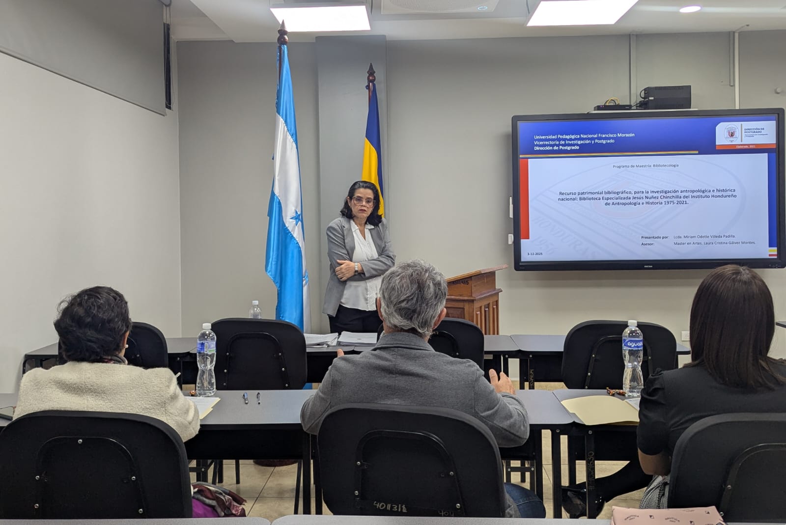 La Licenciada Miriam Odette Villeda Padilla, estudiante de la Maestría en Bibliotecología, Realizo exitosamente la defensa de su tesis titulada “Recurso bibliográfico patrimonial para la investigación histórica y antropológica nacional: Biblioteca Especializada Jesús Núñez Chinchilla del Instituto Hondureño de Antropología e Historia, 1975-2021”; La presentación tuvo lugar el día miercoles 3 de diciembre de 2025, en las instalaciones de Posgrado del Centro Universitario Regional de Tegucigalpa.